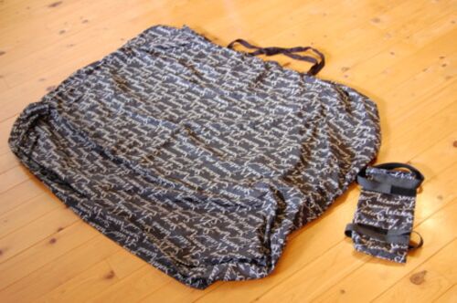 輪行袋.ひとまず1個目試作. 90x90x40:KHSのハンドルを外さなくても入るサイズ(のはず). 最近エコブームで,お買い物袋を自作する人が多いのか, 薄手のナイロンプリント素材のものが ゆざわやにたくさんころがっていた. バリスティックナイロン風の無…